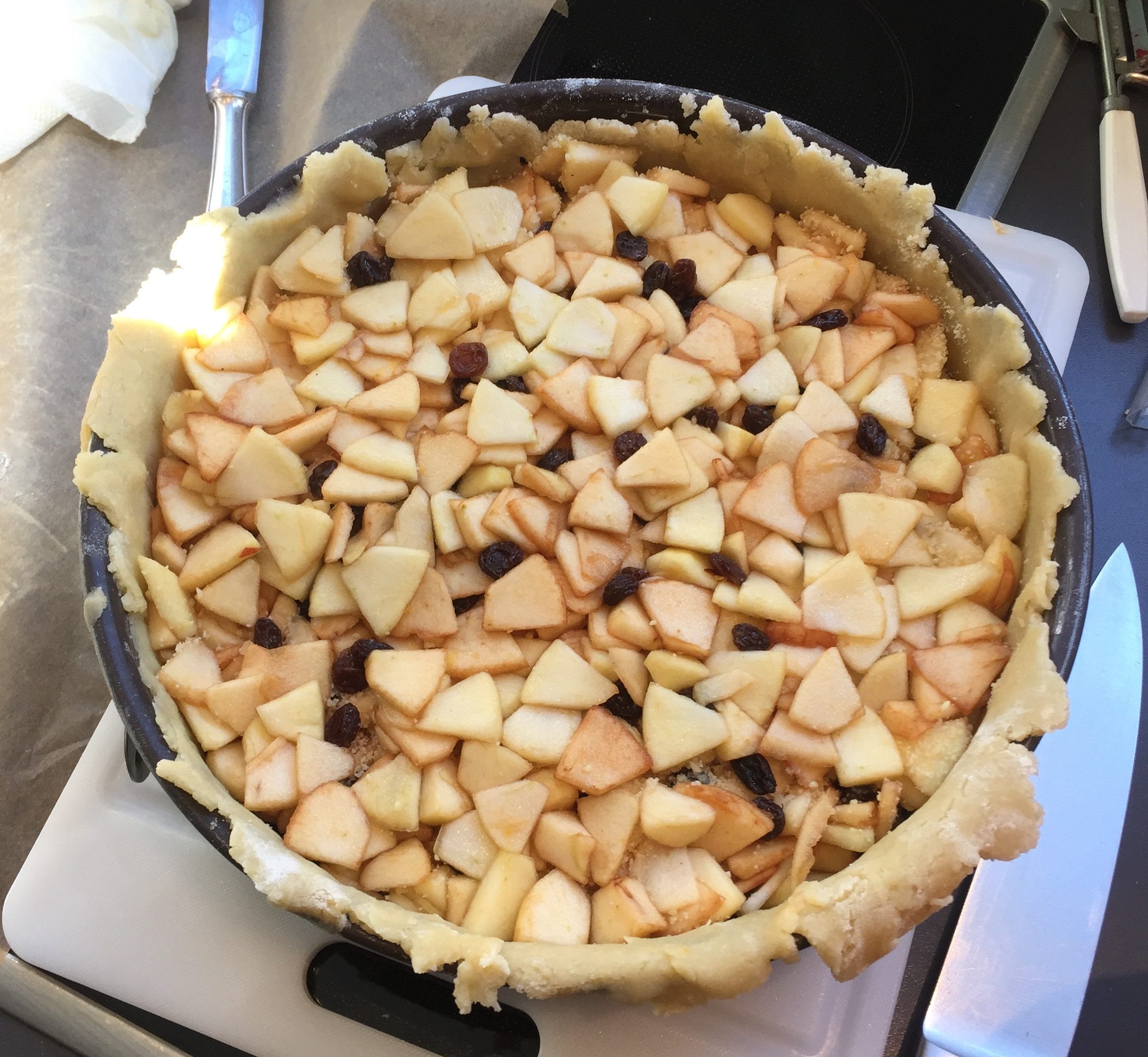 Anschließend das Mehl zusammen mit einem Ei, etwas saurer Sahne oder einem EL Wein mit der kalten Butter schnell zu einem Mürbeteig zusammengehackt.